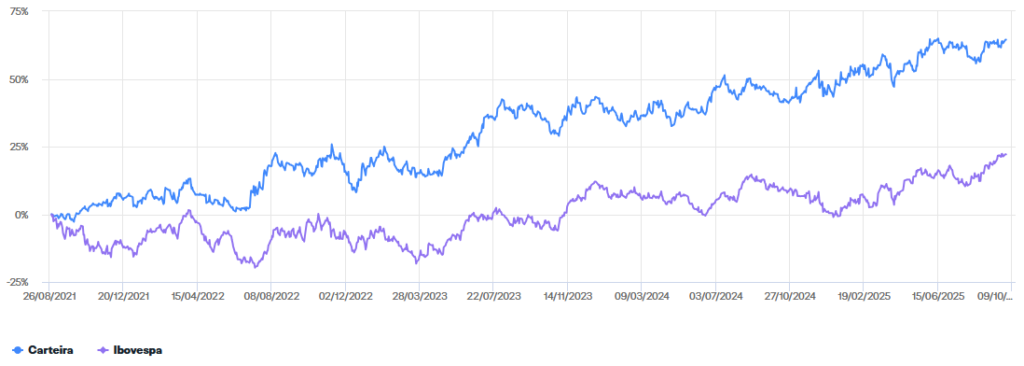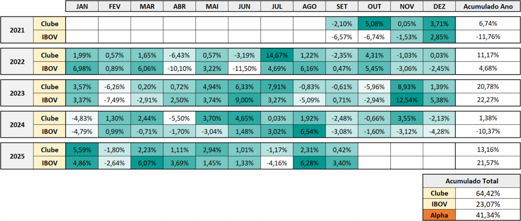 Desde seu início, em 31/08/2021 até 30/09/2025, o Clube de Investimento obteve rentabilidade de +64,42%, enquanto o Ibovespa teve desempenho de 23,07% no mesmo período, ou seja, o Clube obteve performance de 41,34% acima do índice.